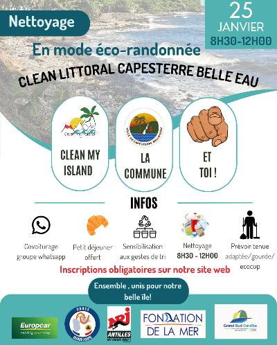 Accueil> Agenda>CLEAN CAPESTERRE BELLE EAU CLEAN CAPESTERRE BELLE EAU Retour vers « Agenda des Evénements »Collecte de déchets CLEAN CAPESTERRE BELLE EAU BOULEVARD MARITIME 97130 CAPESTERRE-BELLE-EAU 25 janvier 2026 - 08:30 à 12:00cleanmyisland@gmail.com S’inscrire à la collecte Évènement proposé par :CleanMyIsland Nettoyage du littoral en mode éco randonnée à Capesterre Belle Eau Viens nous rejoindre avec ta bonne humeur Inscriptions obligatoires sur notre site Géolocalisation et renseignements supplémentaires après l'inscription. S'inscrire à la collecte « * » indique les champs nécessaires Δ Nom*Prénom*E-mail* TéléphoneAdresseCode postalVillePaysAfghanistanAlbanieAlgérieSamoa américainesAndorreAngolaAntigua-et-BarbudaArgentineArménieAustralieAutricheAzerbaïdjanBahamasBahreïnBangladeshBarbadeBiélorussieBelgiqueBelizeBéninBermudesBhoutanBolivieBosnie-HerzégovineBotswanaBrésilBruneiBulgarieBurkina FasoBurundiCambodgeCamerounCanadaCap-VertÎles CaïmansCentrafriqueTchadChiliChineColombieComoresRépublique démocratique du CongoRépublique du CongoCosta RicaCôte d'IvoireCroatieCubaCuraçaoChypreTchéquieDanemarkDjiboutiDominiqueRépublique dominicaineTimor orientalÉquateurÉgypteSalvadorGuinée équatorialeÉrythréeEstonieÉthiopieÎles FéroéFidjiFinlandeFranceFrench PolynesiaGabonGambieGéorgieAllemagneGhanaGrèceGroenlandGrenadeGuamGuatemalaGuinéeGuinée-BissauGuyanaHaïtiHondurasHong KongHongrieIslandeIndeIndonésieIranIrakIrlandeIsraëlItalieJamaïqueJaponJordanieKazakhstanKenyaKiribatiCorée du NordCorée du SudKosovoKoweïtKirghizistanLaosLettonieLibanLesothoLiberiaLibyeLiechtensteinLituanieLuxembourgRépublique de MacédoineMadagascarMalawiMalaisieMaldivesMaliMalteÎles MarshallMauritanieMauriceMexiqueMicronésieMoldavieMonacoMongolieMonténégroMarocMozambiqueMyanmarNamibieNauruNépalPays-BasNouvelle-CalédonieNouvelle-ZélandeNicaraguaNigerNigeriaÎles Mariannes du NordNorvègeOmanPakistanPalaosPalestinePanamaPapouasie-Nouvelle-GuinéeParaguayPérouPhilippinesPolognePortugalPorto RicoQatarRoumanieRussieRwandaSaint-Kitts-et-NevisSainte-LucieSaint-Vincent-et-les GrenadinesSamoaSaint-MarinSao Tomé-et-PrincipeArabie saouditeSénégalSerbieSeychellesSierra LeoneSingapourSaint-MartinSlovaquieSlovénieSalomonSomalieAfrique du SudEspagneSri LankaSoudanSoudan du SudSurinameSwazilandSuèdeSuisseSyrieTaïwanTadjikistanTanzanieThaïlandeTogoTongaTrinité-et-TobagoTunisieTurquieTurkménistanTuvaluOugandaUkraineÉmirats arabes unisRoyaume-UniÉtats-UnisUruguayOuzbékistanVanuatuSaint-Siège (État de la Cité du Vatican)VenezuelaViêt NamÎles Vierges britanniquesÎles Vierges des États-UnisYémenZambieZimbabweMessageNewsletter Je souhaite m’abonner à la liste de diffusion de la Fondation de la Mer pour être tenu au courant des actions et des nouveaux programmes. Partager cet article: Partager sur FacebookPartager sur TwitterEnvoyer à un amiCopy to clipboard